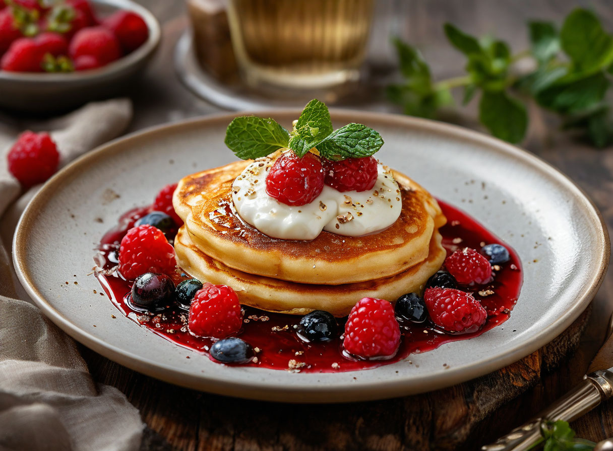 Нежные творожные оладьи без добавления сахара, подаются с ягодным соусом. Отличный выбор для полезного завтрака.