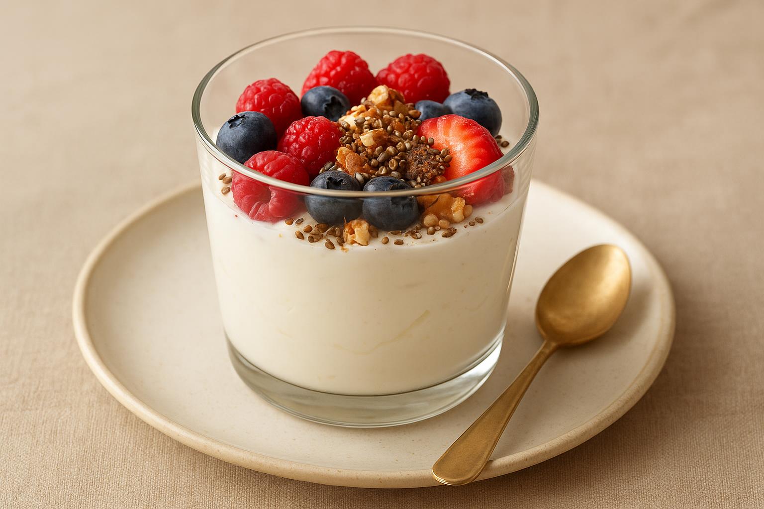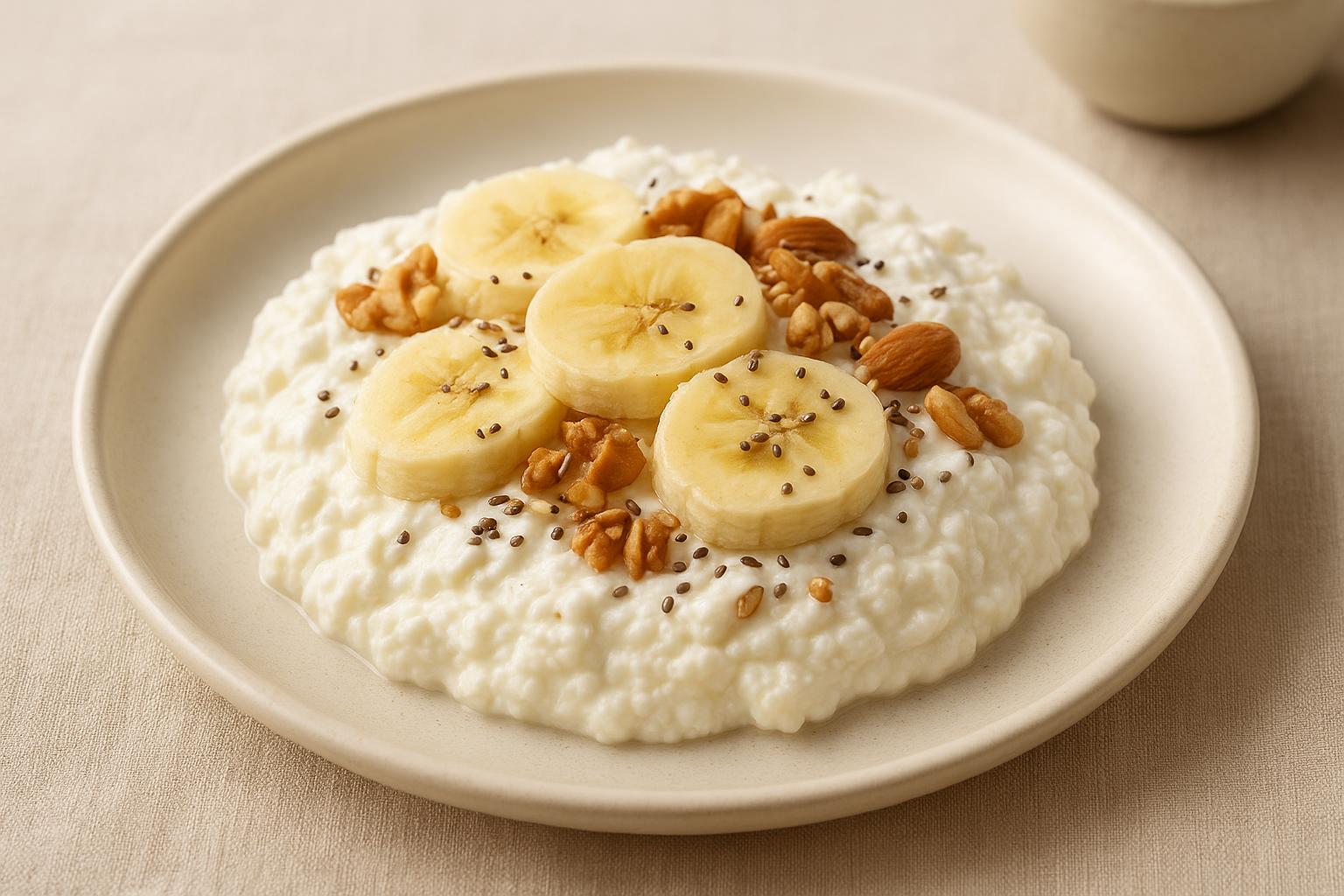 Творожный десерт с бананом Нежный творожный десерт с бананом — быстрый высокобелковый перекус с мягкой сладостью и естественной кремовой текстурой. Он легко адаптируется под вкус и задачи дня благодаря добавке из орехов или семян.