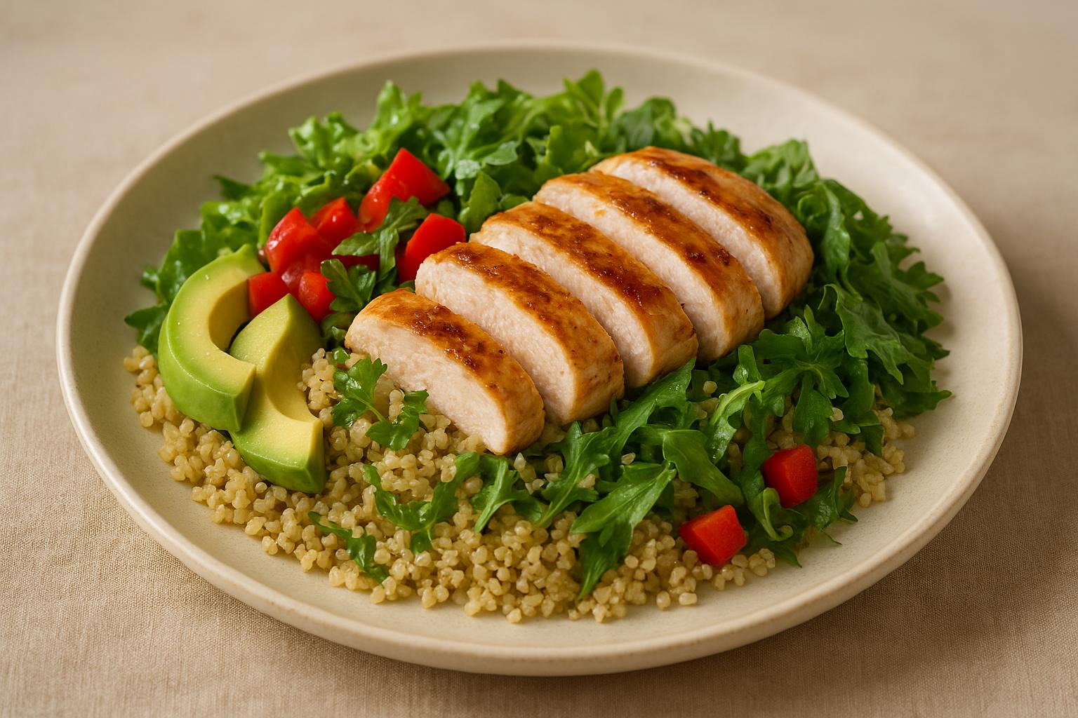 Салат с курицей Салат с курицей — спокойный, собранный обед с чистым вкусом и понятной структурой: сочное филе, листовая зелень, цельнозерновая или бобовая основа и свежий овощной акцент. Блюдо легко адаптировать под сезон, аппетит и нужный уровень сытости, не теряя баланса.