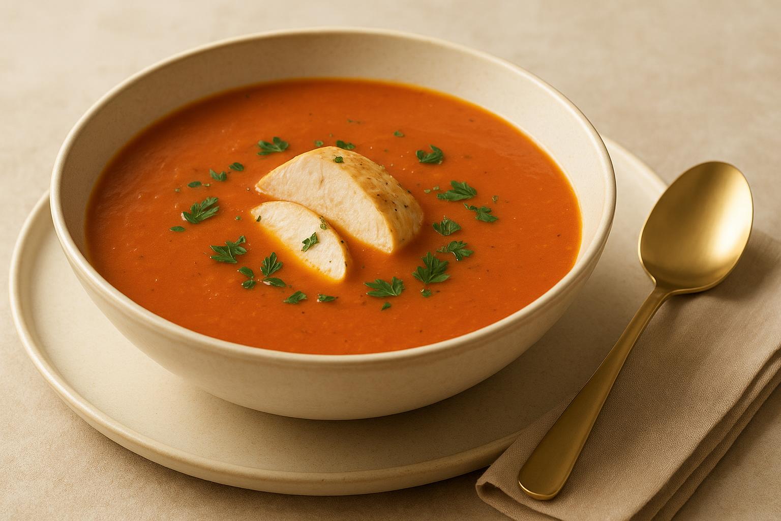 Томатный суп Томатный суп — это тёплое и насыщенное блюдо для обеда с комфортной текстурой и ярким вкусом.